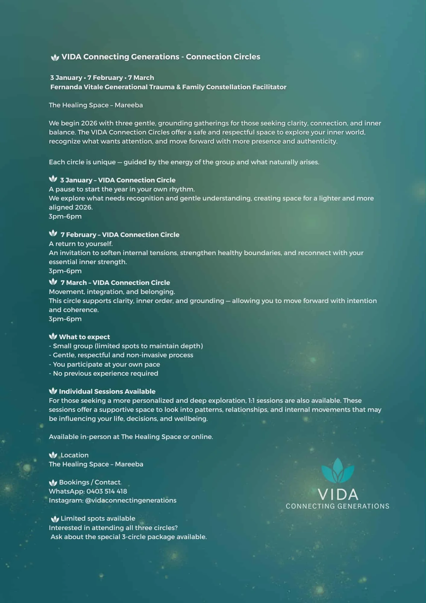 We begin 2026 with three gentle, grounding gatherings for those seeking clarity, connection and inner balance. The VIDA Connection Circles offer a safe and respectful space to explore your inner world, recognize what wants attention, and move forward with more presence and authenticity.